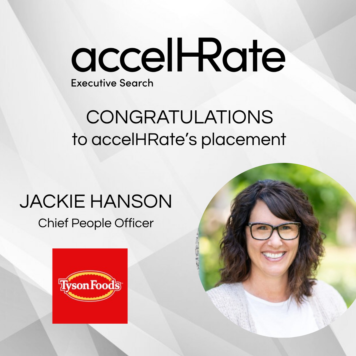 accelHRate’s Placement Jackie Hansen at Tyson Foods recently promoted from Vice President, Human Resources, Poultry Business to Chief People Officer